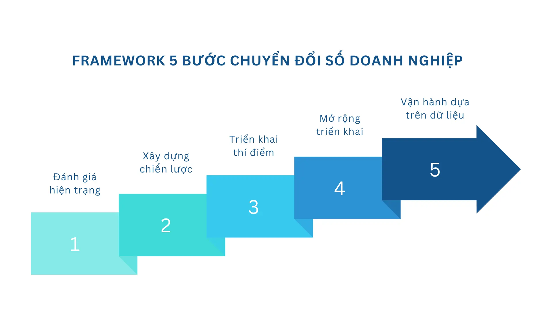 Lộ trình chuyển đổi số thường được triển khai theo 5 giai đoạn gồm: đánh giá hiện trạng, xây dựng chiến lược, triển khai thí điểm, mở rộng triển khai và vận hành dựa trên dữ liệu. Việc triển khai theo từng giai đoạn giúp doanh nghiệp giảm rủi ro đầu tư, kiểm chứng hiệu quả và tối ưu nguồn lực trước khi mở rộng trên toàn tổ chức.