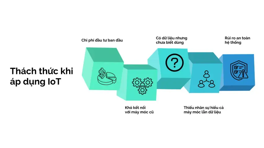 Khó khăn đầu tiên là chi phí đầu tư và việc xác định điểm bắt đầu phù hợp. Để triển khai IoT, doanh nghiệp cần lắp cảm biến lên máy móc, cài đặt thiết bị kết nối và xây dựng hệ thống thu thập dữ liệu, nên phải bỏ ra một khoản kinh phí ban đầu. Trong khi đó, lợi ích như giảm hỏng máy, tiết kiệm điện hay tăng năng suất thường chỉ xuất hiện sau một thời gian vận hành. Nếu doanh nghiệp chưa xác định rõ mục tiêu cụ thể, chẳng hạn muốn theo dõi máy nào, giảm sự cố ở công đoạn nào hoặc tiết kiệm chi phí ở khâu nào, việc đầu tư dễ bị dàn trải, lắp nhiều thiết bị nhưng không cải thiện rõ rệt hiệu quả vận hành.