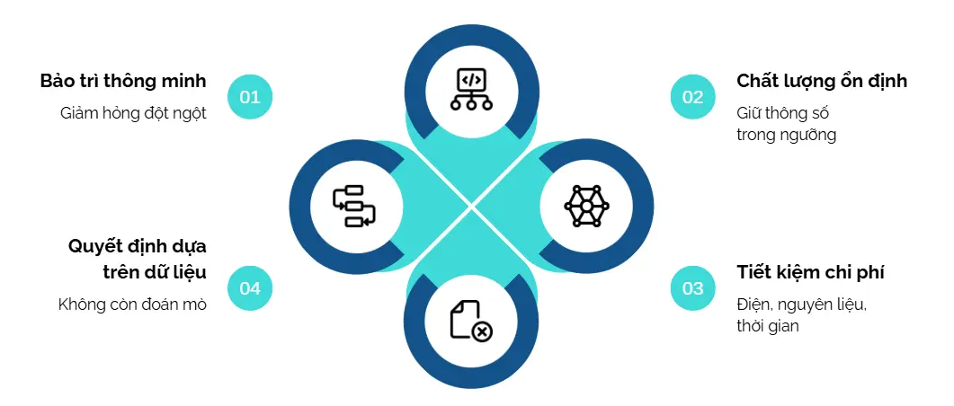 Lợi ích dễ thấy nhất của IoT là giúp doanh nghiệp theo dõi và kiểm soát nhà máy tốt hơn. Khi máy móc gửi dữ liệu liên tục, người quản lý có thể biết công đoạn nào đang làm chậm tiến độ, máy nào hoạt động không ổn định và lúc nào năng suất giảm. Việc điều chỉnh vì thế dựa trên tình trạng thật của nhà máy, thay vì dựa vào cảm giác hoặc kinh nghiệm cá nhân. Một lợi ích quan trọng khác là giảm chi phí sửa chữa và hạn chế dừng máy bất ngờ. Khi theo dõi độ rung, nhiệt độ hoặc tốc độ chạy của máy, doanh nghiệp có thể phát hiện sớm dấu hiệu xuống cấp và lên kế hoạch sửa trước khi máy hỏng nặng. Cách làm này giúp giảm thời gian dừng máy, tránh tổn thất lớn và kéo dài thời gian sử dụng thiết bị. IoT cũng giúp cải thiện chất lượng sản phẩm và giảm lãng phí. Khi các thông số kỹ thuật được theo dõi liên tục, doanh nghiệp có thể giữ quy trình trong mức cho phép. Nếu có chỉ số vượt ngưỡng, hệ thống sẽ báo để điều chỉnh ngay trong lúc sản xuất, nhờ đó giảm sản phẩm lỗi. Đồng thời, dữ liệu về điện, nước và nguyên liệu cũng cho thấy khâu nào đang tiêu tốn nhiều hơn bình thường, giúp doanh nghiệp tìm cách tiết kiệm chi phí.