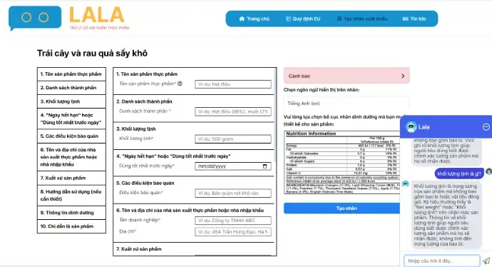 - Phần mềm trợ lý ảo Lala: Dự án đã phát triển phiên bản chạy thử của trợ lý số Lala, một công cụ kỹ thuật số giúp người dùng tạo nhãn thực phẩm một cách thuận tiện và tuân thủ quy định EU.