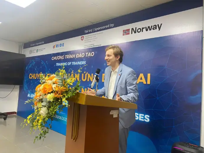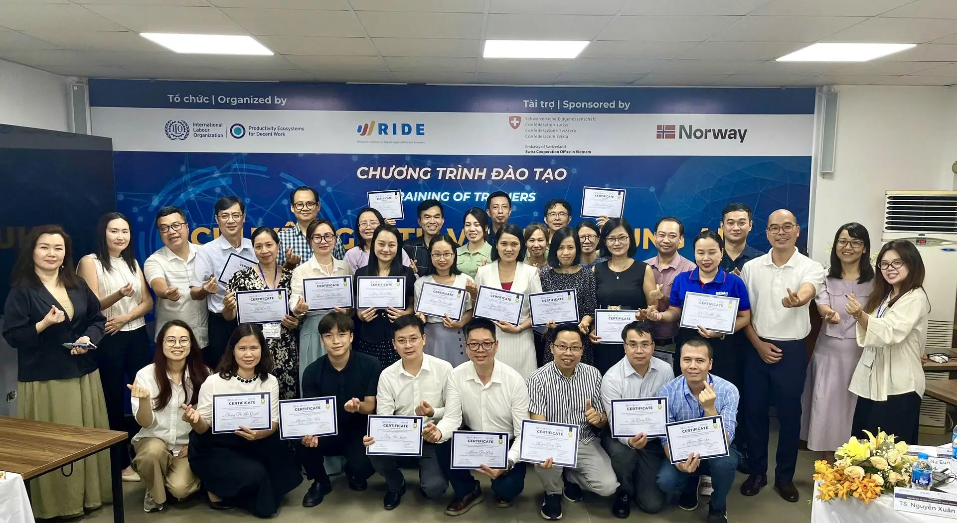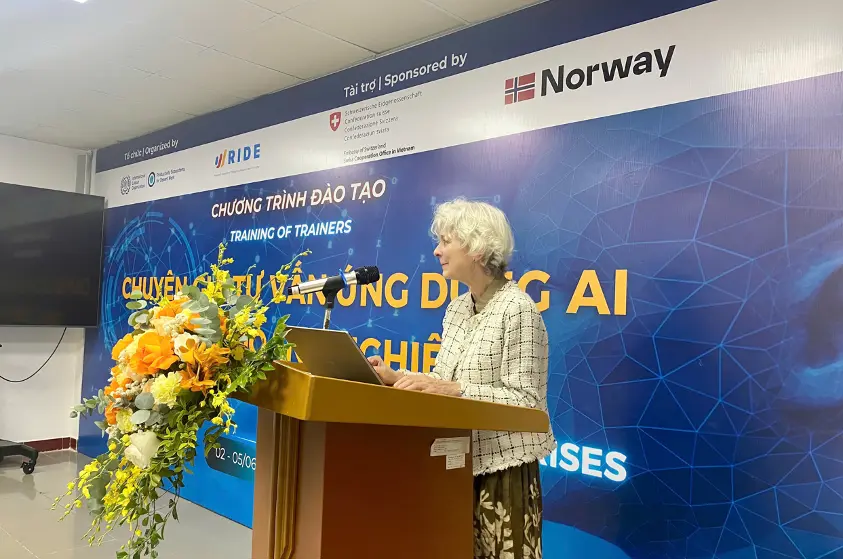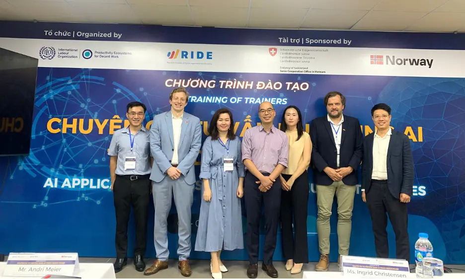 Khoá đào tạo TOT (Training of Trainers) “Chuyên gia tư vấn ứng dụng AI trong doanh nghiệp” được triển khai bởi Viện Nghiên cứu Tổ chức và Kinh tế số (RIDE) trong khuôn khổ dự án Hệ sinh thái năng suất vì việc làm bền vững (PE4DW) của Tổ chức Lao động quốc tế (ILO) được tài trợ bởi Tổng cục kinh tế Liên bang Thụy Sỹ (SECO) và Tổ chức hợp tác phát triển Na Uy (NORAD) đã diễn ra thành công tại Hà Nội.