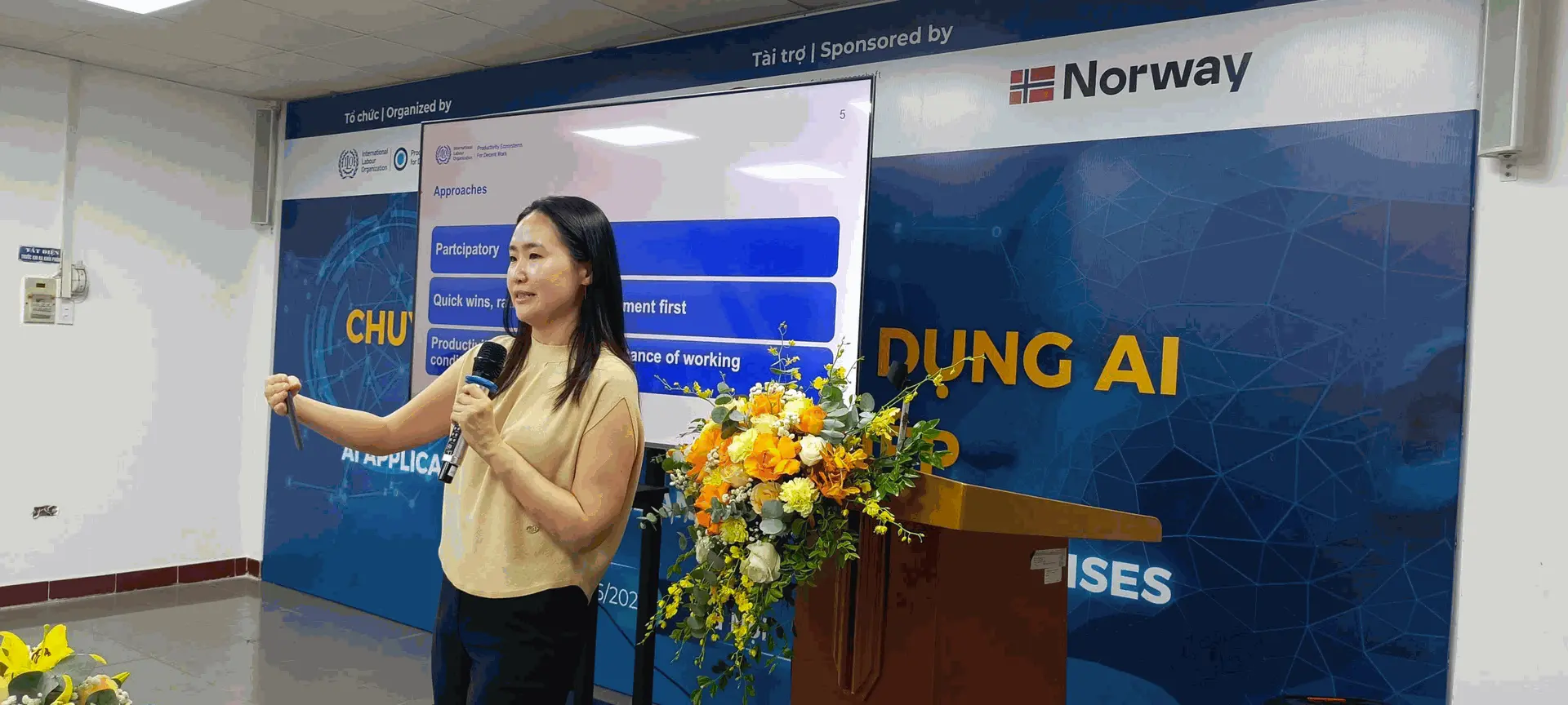 Trong phần khai mạc, bà Mun Na Eun, Cán bộ Dự án PE4DW (ILO), cũng đã chia sẻ sâu sắc về định hướng thiết kế chương trình đào tạo: không đơn thuần là chuyển giao kiến thức, mà là xây dựng năng lực tư duy và thực hành tư vấn ứng dụng AI trong môi trường doanh nghiệp thực tế