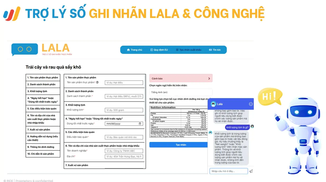 Trợ lý số LALA – công cụ hỗ trợ doanh nghiệp thực phẩm tiếp cận các yêu cầu ghi nhãn của EU theo cách có hệ thống, dễ áp dụng và sát thực tế. LALA hướng dẫn cả ghi nhãn vật lý và nhãn điện tử, giúp doanh nghiệp kiểm tra, điều chỉnh và hoàn thiện nhãn sản phẩm, qua đó giảm rủi ro pháp lý và chi phí tuân thủ khi xuất khẩu.
